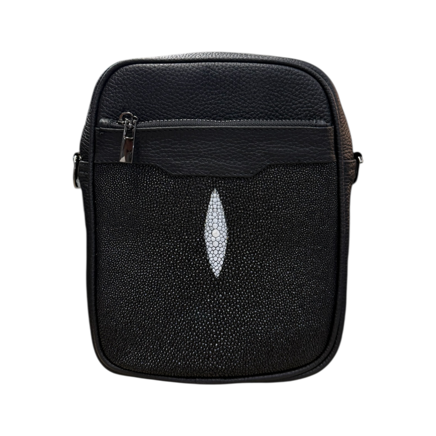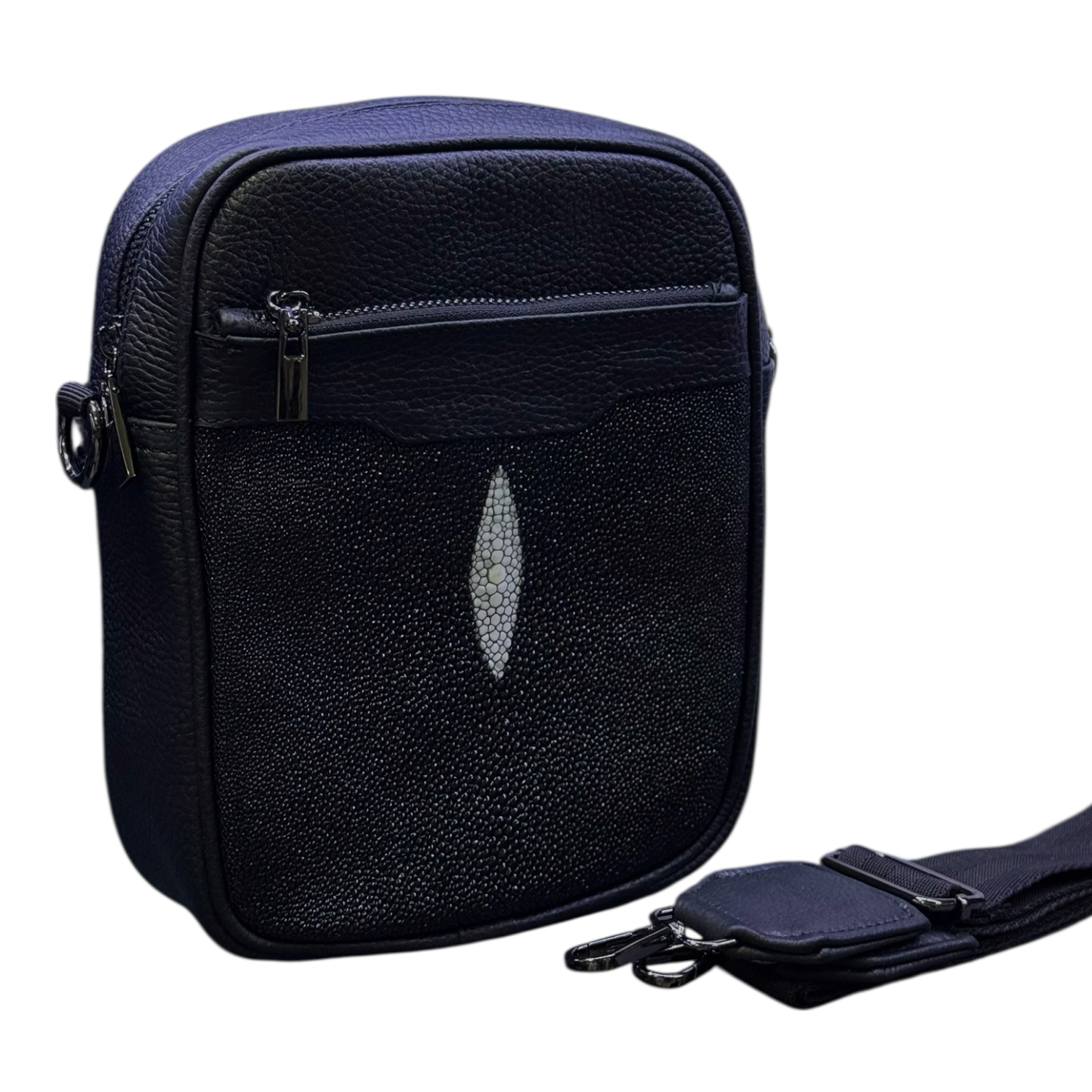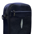 Presentamos LARRÓN XS, nuestro modelo más pequeño pero igual de llamativo. Elaborado en piel con una sorprendente aplicación de piel de mantarraya. Con su cómoda asa para llevar al hombro, este bolso no solo es elegante, sino también práctico.