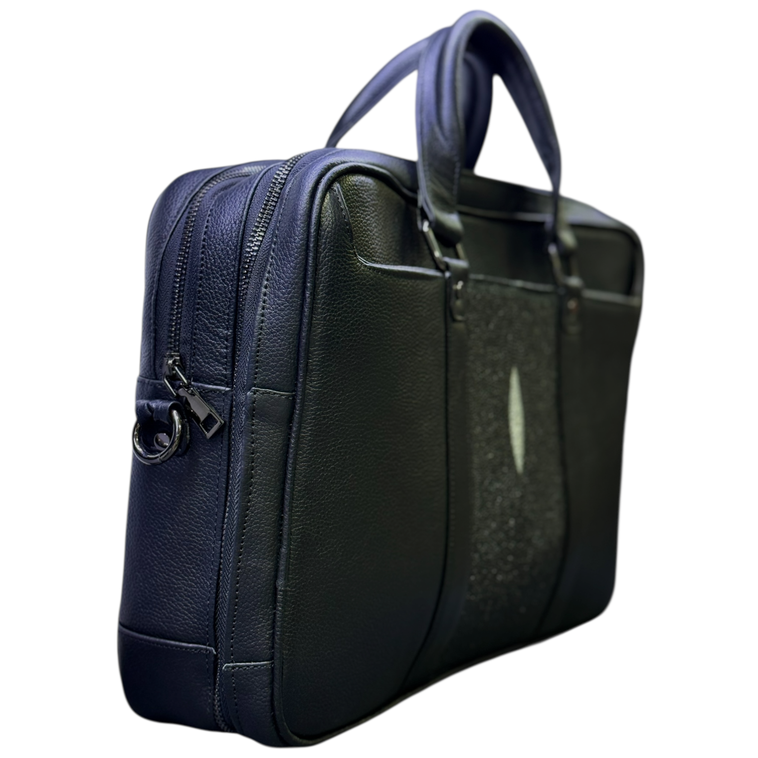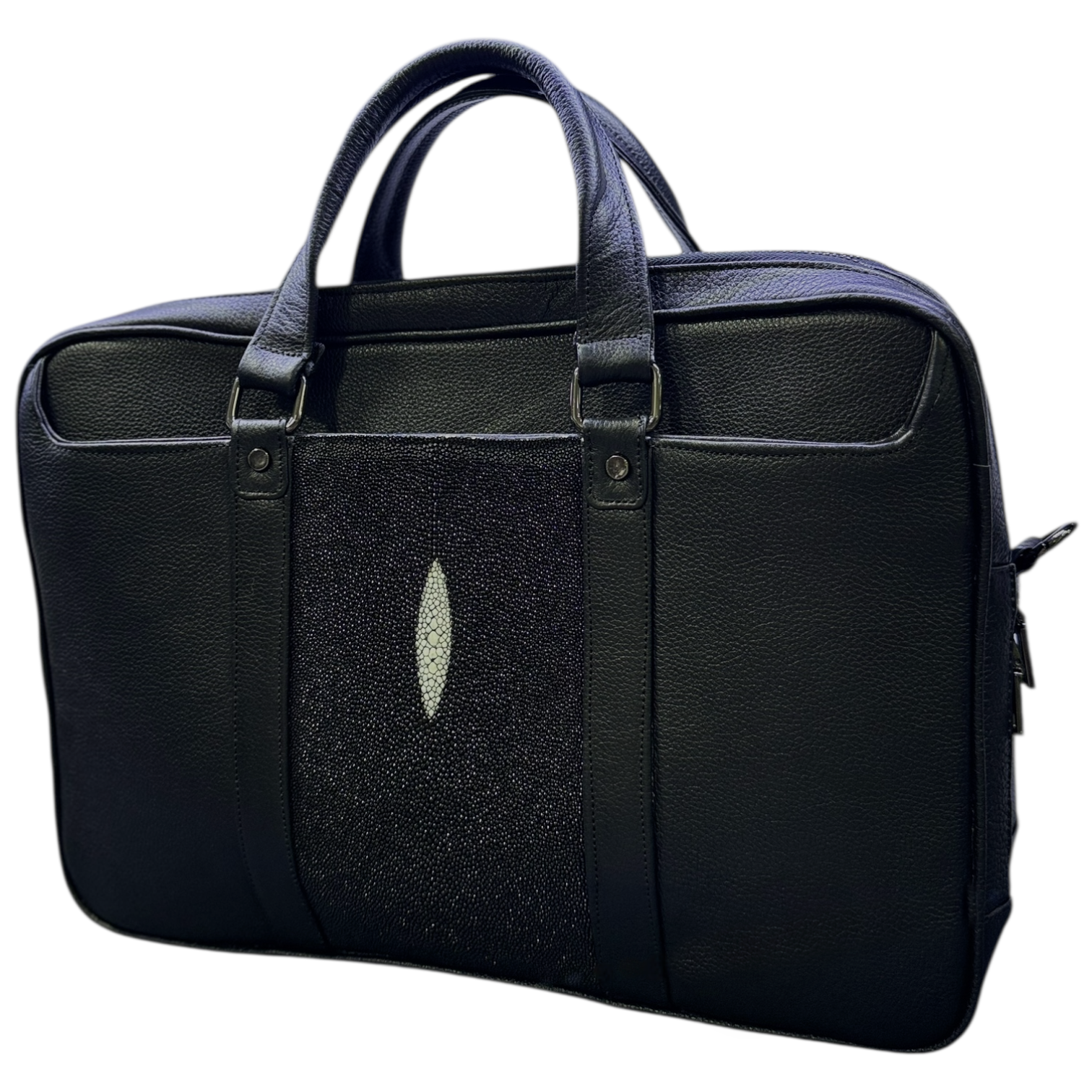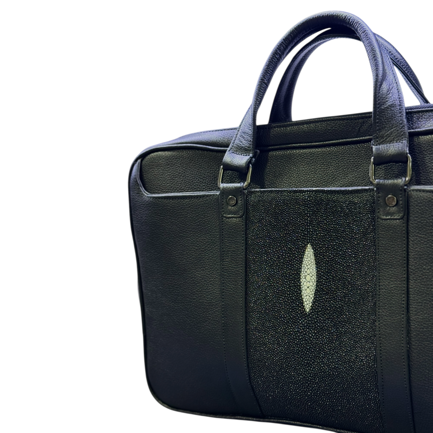 Eleva tu estilo profesional con este exclusivo maletín elaborado en piel genuina de alta calidad, que incorpora una elegante aplicación de mantarraya para un acabado sofisticado y distintivo. Diseñado para ofrecer funcionalidad y organización, cuenta con dos cierres externos y cierres internos que brindan mayor seguridad a tus pertenencias.